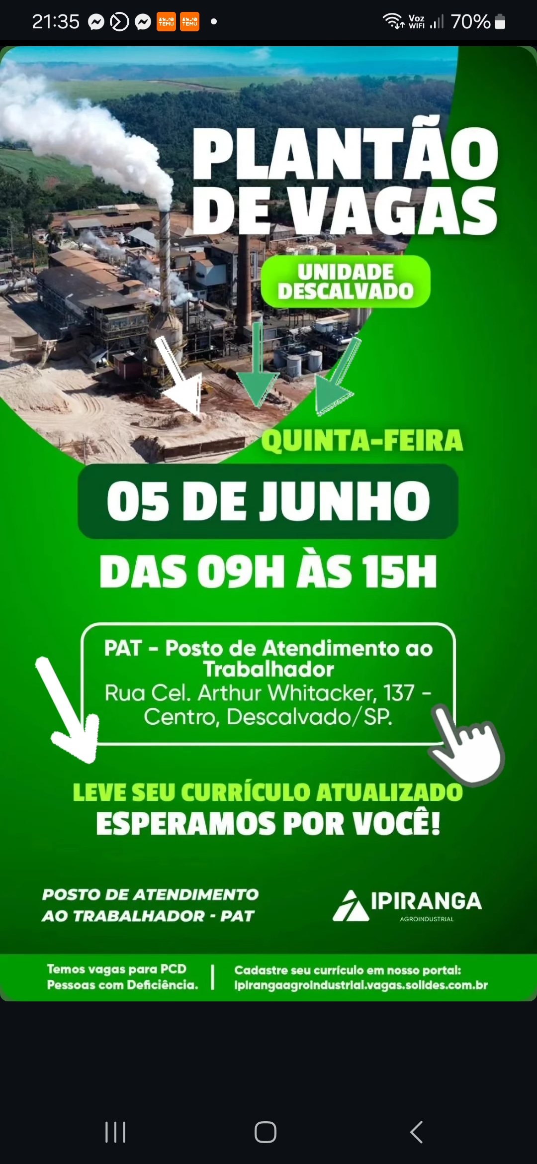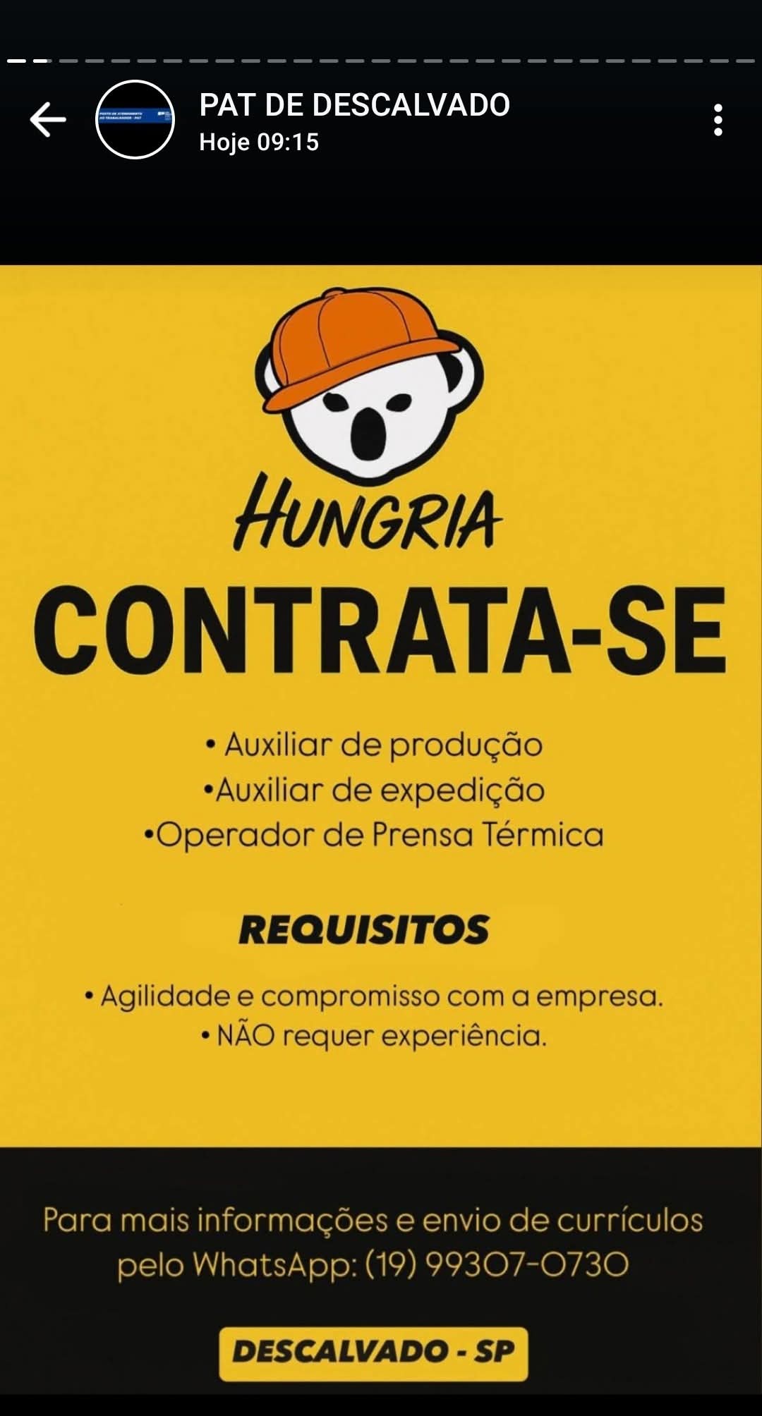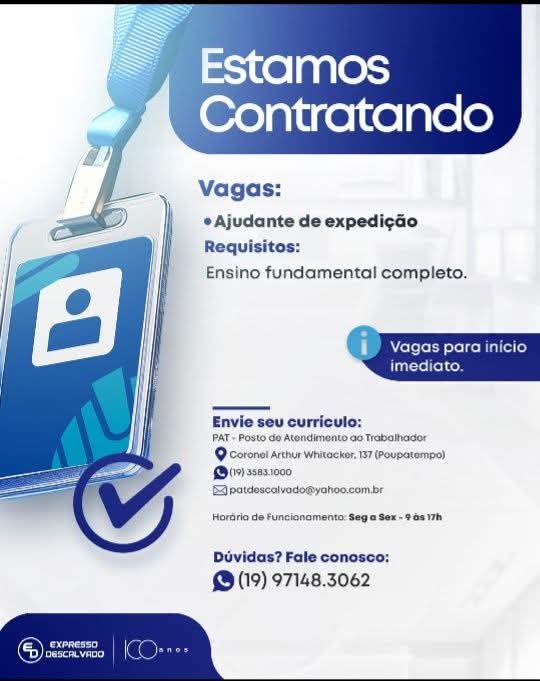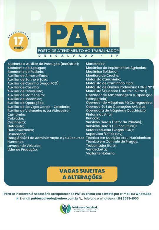 O Posto de Atendimento ao Trabalhador (PAT) de Descalvado-SP divulgou a lista atualizada de opor...