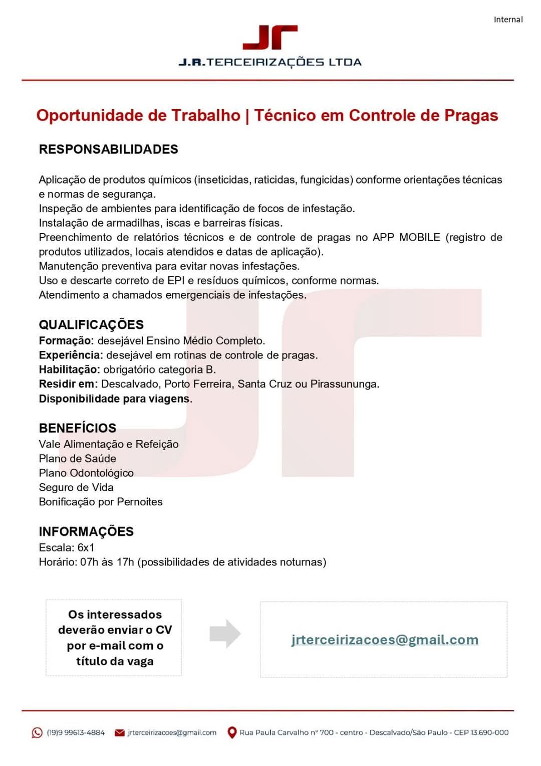 A J.R. Terceirizações está com vaga aberta para Técnico em Controle de Pragas! Se você é proativ...