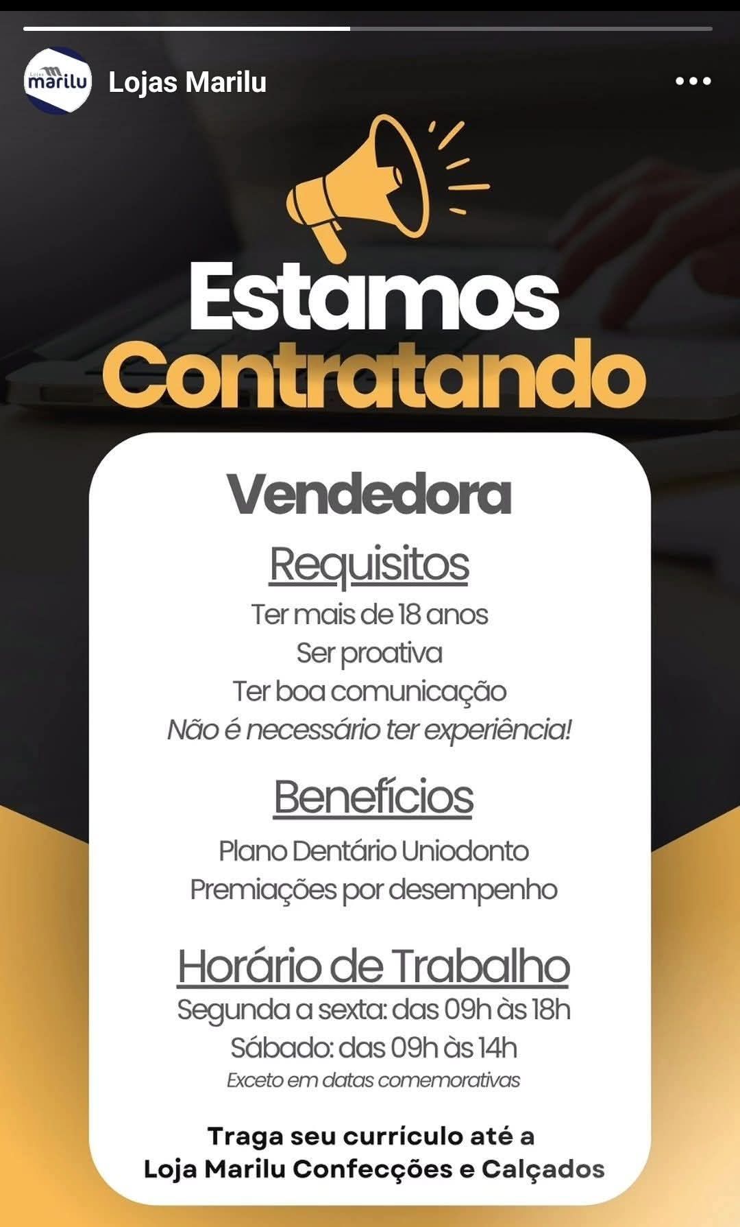 A Loja Marilu Confecções e Calçados está contratando Vendedora!Se você tem vontade de aprender, ...