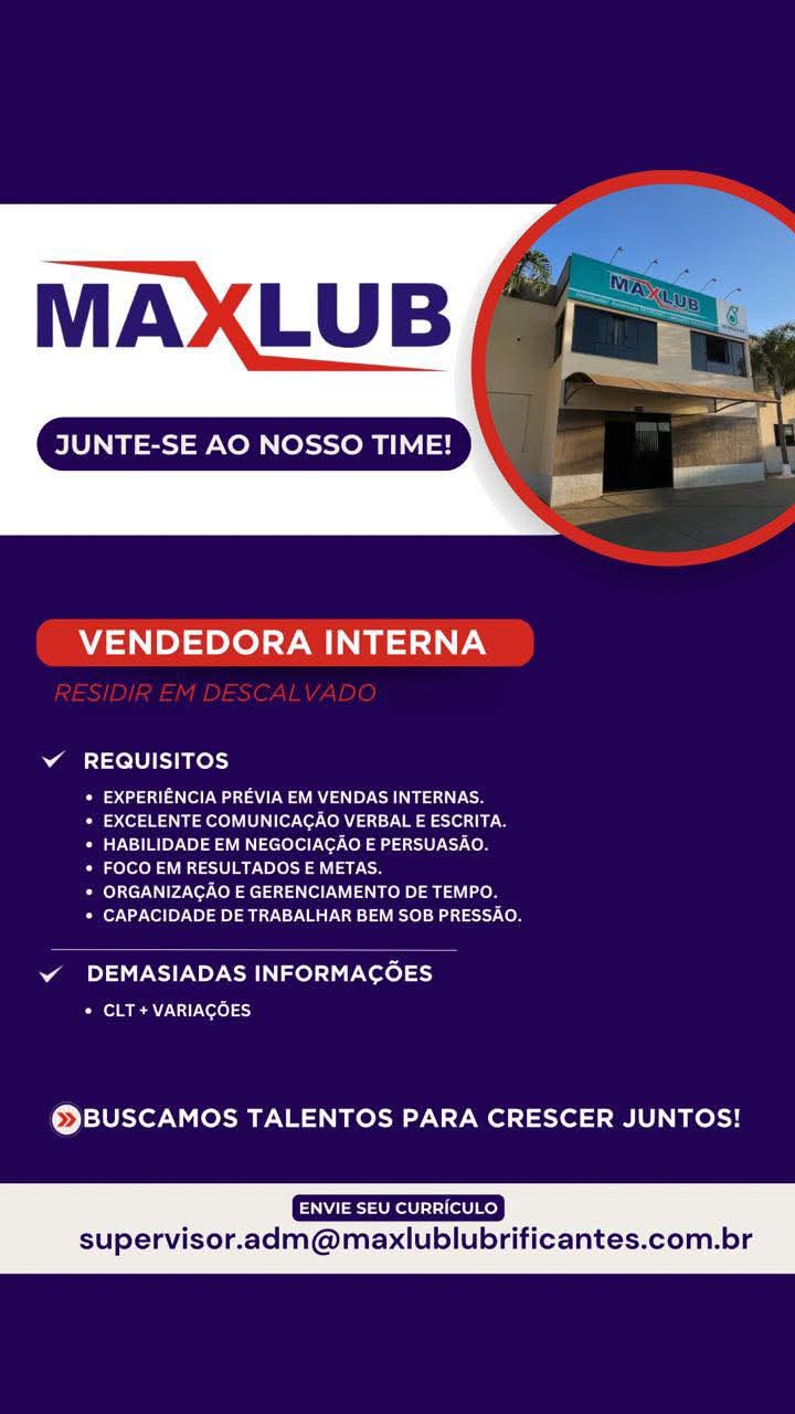 A Maxlub, empresa referência no ramo de lubrificantes, está com vaga aberta para Vendedora Inter...