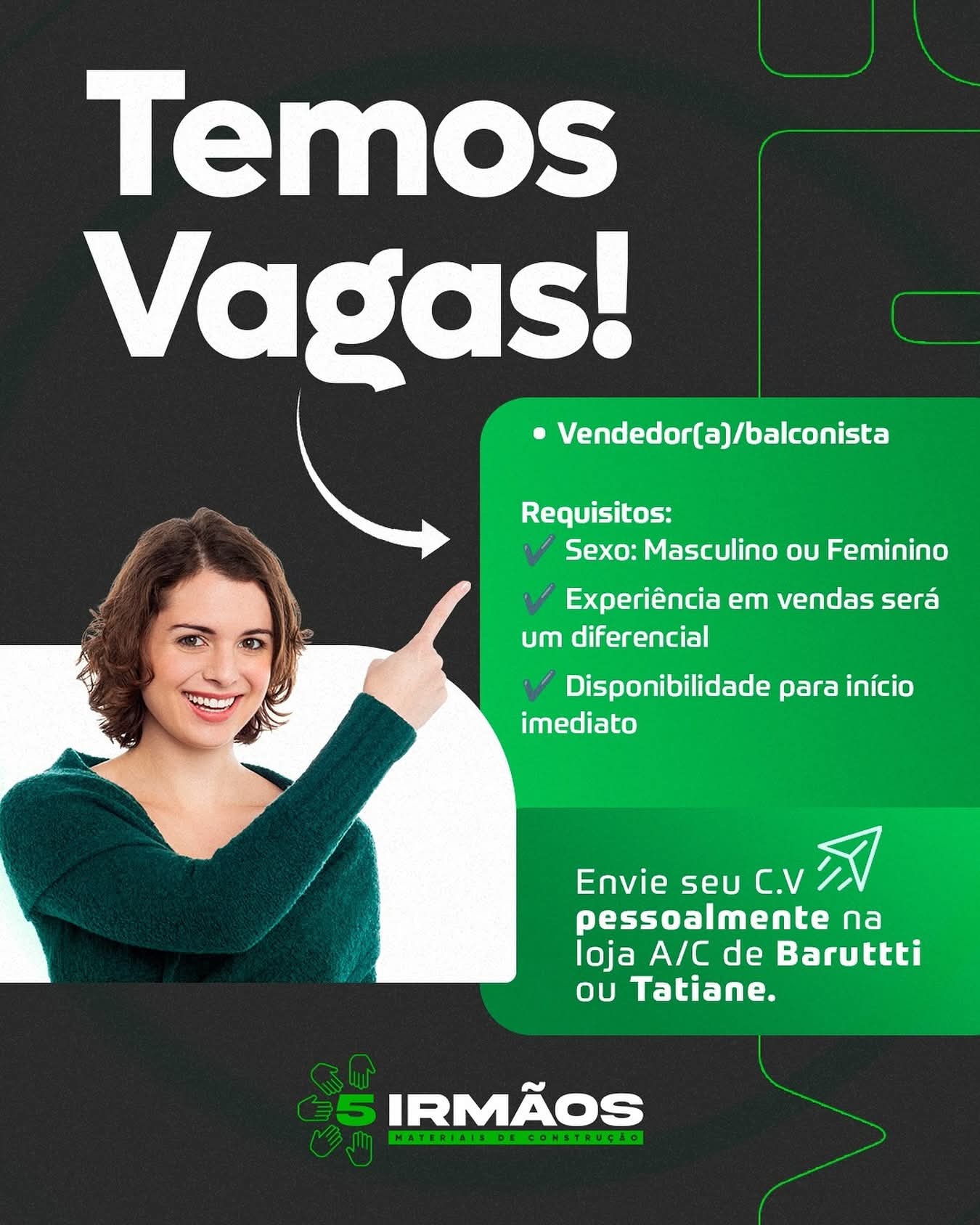 A loja 5 Irmãos Materiais de Construção está com vaga aberta para o cargo de Vendedor(a)/Balconi...