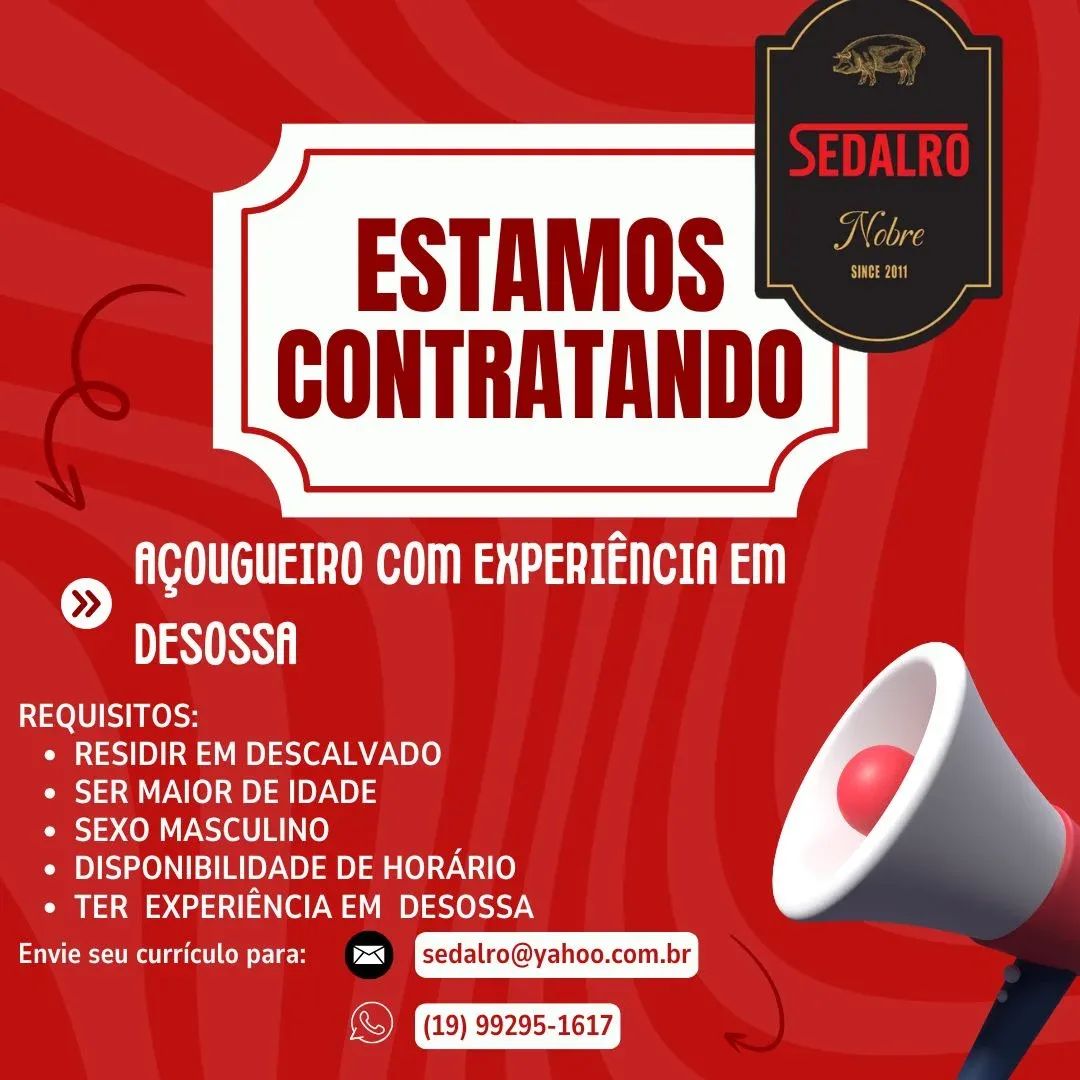 A empresa Sedalro Nobre, referência em qualidade no ramo de carnes desde 2011, está com vaga abe...