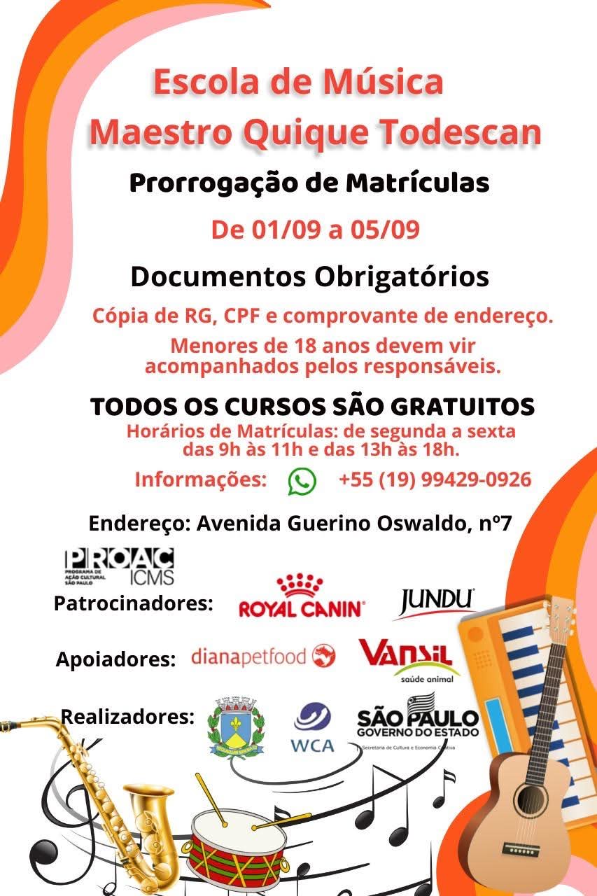 A Escola de Música Maestro Quique Todescan anunciou a prorrogação do período de matrículas, que ...