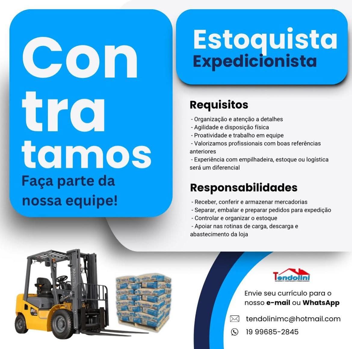 A empresa Tendolini está com oportunidade aberta para a função de Estoquista/Expedicionista, ofe...